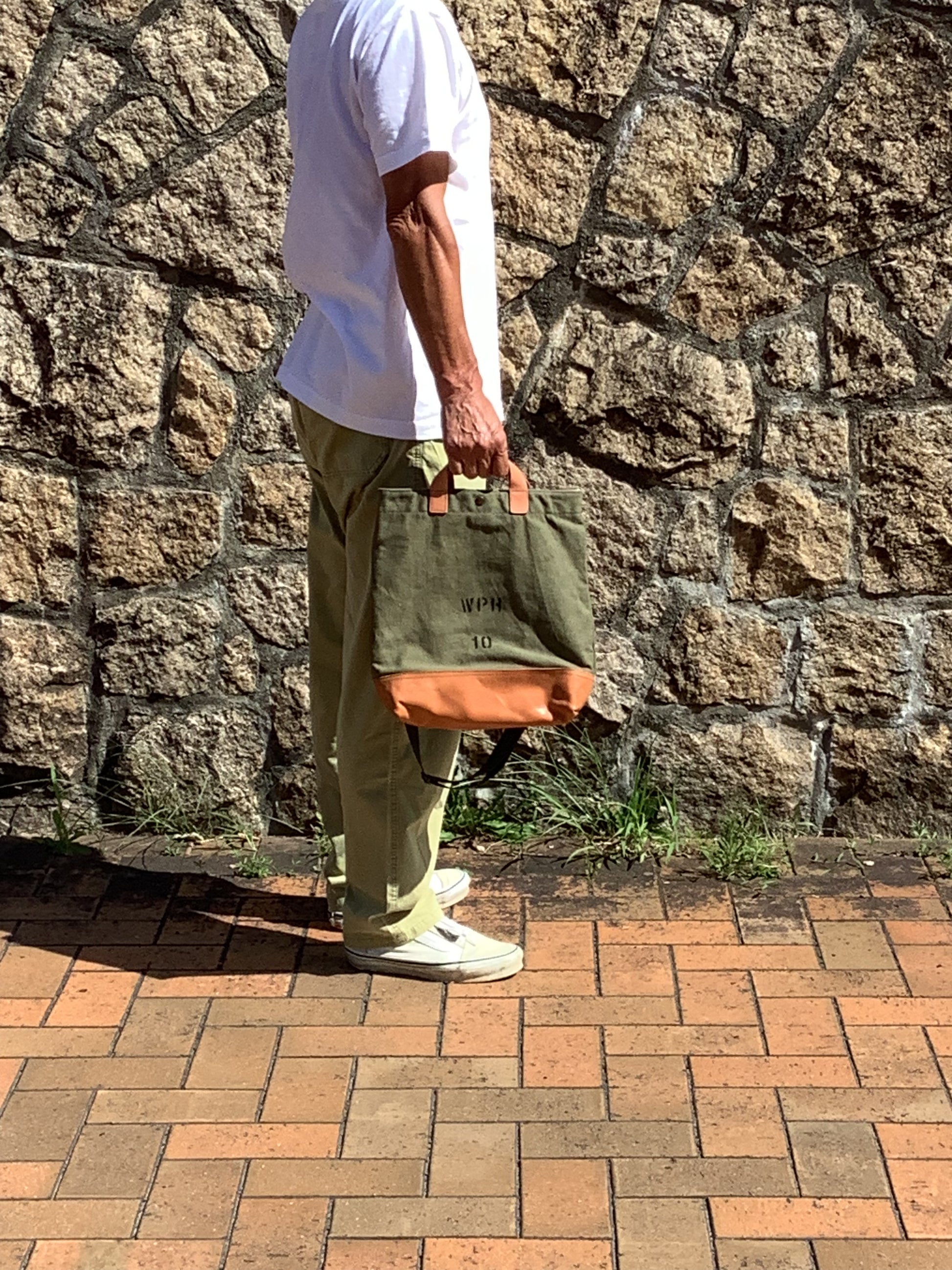 厚手のオリーブ帆布/キャンバスを中心にリメイクしたA4トートバッグ